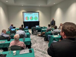 Moore concluded with forecasting/economic data, starting with CropLife magazine’s 2025 national survey of agricultural retailers and cooperatives conducted this summer. The graph showed a decrease in custom application services this year compared to 2024. For example, 86% of those surveyed in 2024 provided variable rate technology (VRT) fertilizer applications versus 84% this year; 43% of those surveyed in 2024 provided VRT custom pesticide applications versus 40% this year; and 35% of those surveyed in 2024 applied crop inputs with a drone versus 27% this year—a drop in applications in all three categories in a year’s time.