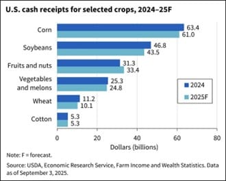 Moore began by providing details about the U.S. agricultural economy to date, stating that net farm income, as forecasted by the USDA, is expected to increase in 2025 due to livestock revenue and a sizeable increase in government assistance. It is forecast at $179.8 billion—$52 billion, or 40.7% higher than in 2024 (37.2% when adjusted for inflation). Government farm payments for the year are projected at $40.5 billion—a $30.4 billion increase from 2024. These direct government supplemental and ad hoc disaster assistance payments resulted from payments approved this summer in the American Relief Act of 2025 (H.R. 1, One Big Beautiful Bill). Total production expenses for farmers in 2025 are forecast to be $467.4 billion, an increase of $12 billion, or 2.6% from 2024. While government payments and production expenses increased in 2025, forecasted crop cash receipts are expected to decrease $6.1 billion or 2.5% compared to 2024. Cash receipts were largely lower due to price declines across most crops (fruits and nuts were exceptions) relative to 2024. Combined receipts for corn, soybeans and wheat are forecast to fall $6.8 billion in total (see Figure 1).