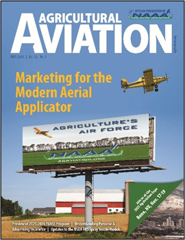 The Fall 2025 issue of Agricultural Aviation is available online and in the Agricultural Aviation Magazine App. Stories include a featured article on members who are positively marketing the industry and their businesses, an overview of the 2025 Ag Aviation Expo taking place in Reno, Nevada, Nov. 17-19, a review of what you’ll learn in the 2025-2026 PAASS program, and much more!