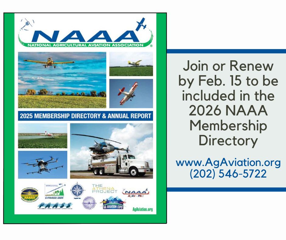 Your NAAA membership will continue to provide valuable benefits that support your business and that have protected the industry for 60 years. Receive discounts for attending or exhibiting at the Ag Aviation Expo, Nov. 16-18 in Savannah, GA; access to the 2026 NAAA Membership Directory in both print and online formats to connect with fellow members; and stay informed through the new NAAA 365 App, our publications, eNewsletters, social media updates, and in-depth online content at AgAviation.org. To renew, log in to your account at AgAviation.org and pay your 2026 membership invoice.